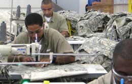 Prisoners work in a UNICOR (Federal Prison Industries – UNICOR is the trade name) program producing military uniforms. UNICOR logo is visible in the background.